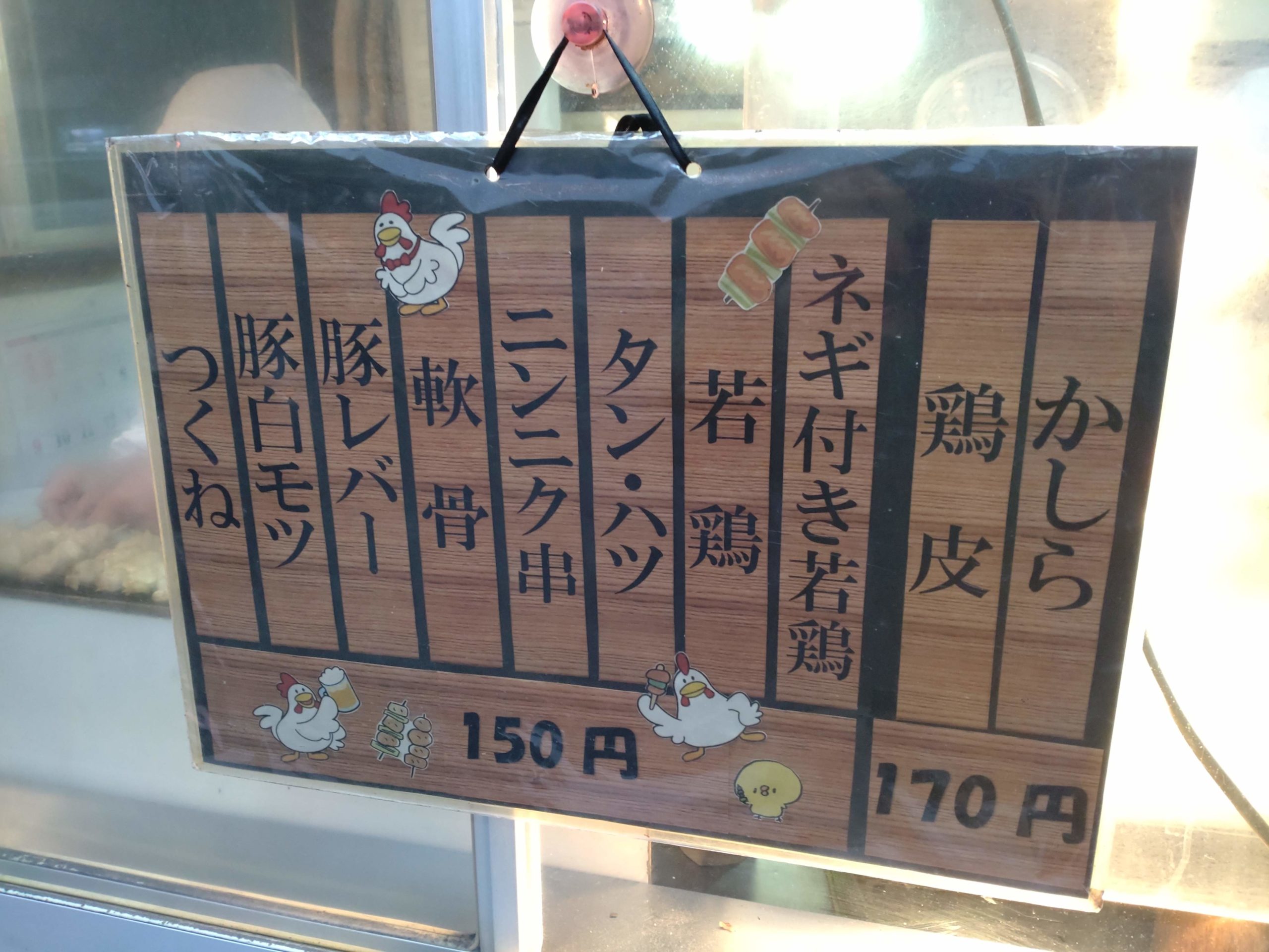 焼き鳥・もつ焼きは1本150円or170円で購入可能です。